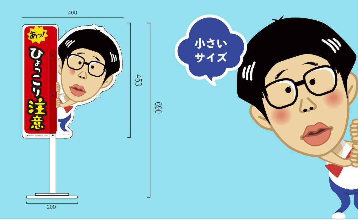 飛び出しひょっこりはんのサイズ小(※1)です。事故が良く発生しそうな学校や施設の近辺への設置(※2)が可能です。個人でご購入のお客様は、ご自宅やお勤め先の会社などの敷地内での設置をお願いいたします。